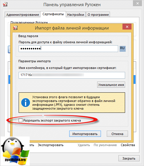 - Введите пароль, который указывали при экспорте (пункт 10) и поставьте галочку на пункте «Пометить этот ключ как экспортируемый…», иначе контейнер нельзя будет скопировать в дальнейшем. Нажмите «Далее».