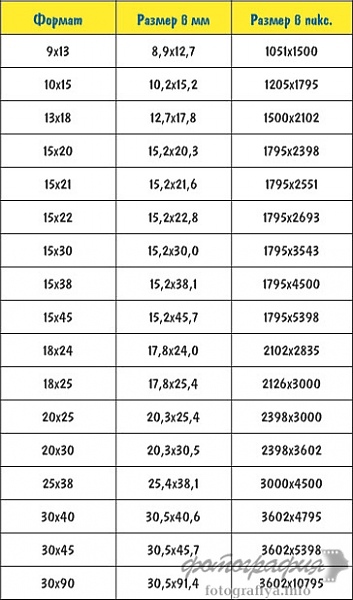 В этой таблице указаны рекомендуемые разрешения для файлов, но можно рассматривать пригодными к печати фотографии, имеющие хотя бы половину от этих значений.