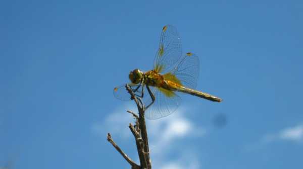 Стрекоза держится за сухую веточку