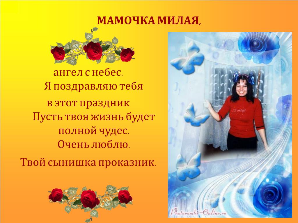 Именно мама своей верой и заботой помогает развивать наши способности и преодолевать трудности, переживает вместе с нами победы и поражения, любит нас ещё до нашего появления на свет.