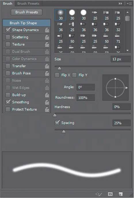 На панели параметров выберите мягкую круглую кисть.