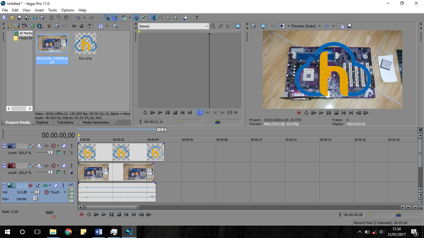 Выберите образец клипа в окне мультимедиа проекта и перетащите клип в окно временной шкалы. Если Vegas спросит: «Хотите ли вы настроить параметры видео для вашего проекта, чтобы они соответствовали этому медиафайлу?» выберите Да