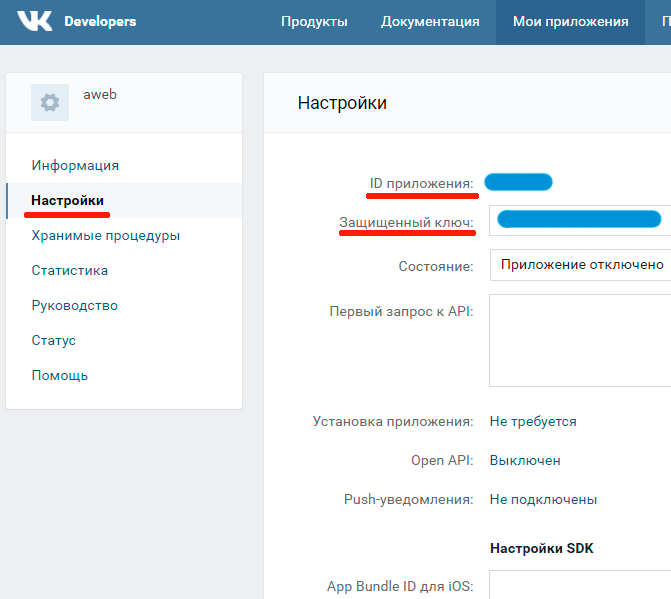 Если вы уходите и вам нужно вернуться во Вконтакте, перейдите по адресу https://vk.com/devи выберите Мои приложения. Затем вы можете управлять новыми приложениями, которые вы создали.Перейдите к настройкам своего приложения, где вы найдете идентификатор приложения и ключ безопасности . Вы будете использовать эту информацию, как показано здесь: