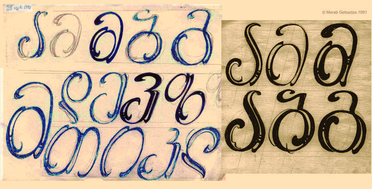 C Гецадзе сотрудничает и Манана Арабули, основательница дизайн-студии Black Dog: «Мераб — наш основной исполнитель. В Грузии вообще очень мало шрифтовых дизайнеров, с которыми можно было бы работать, но в наших проектах мы стараемся пользоваться собственными шрифтами». Среди прочего, Black Dog стали пионерами в возобновлении традиций грузинской типографики и восстановлении шрифтов, использовавшихся в XIX веке и начале XX. Для их проекта «Возрождение» дизайнер Малхаз Яшвили нарисовал семь шрифтов, основанных на надгробных надписях в национальном пантеоне на горе Мтацминда.