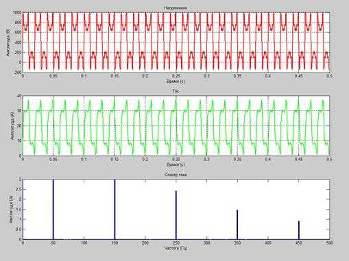 Графики напряжения, тока и Фурье-спектр приведены на рисунке 2.