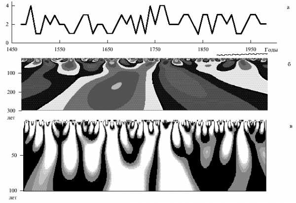 Отображение преобразования.Результатом вейвлет-преобразования одномерного числового ряда (сигнала) является двумерный массив значений коэффициентов С(a,b). Распределение этих значений в пространстве (a,b) — временной масштаб, временная локализация, дает информацию об изменении во времени относительного вклада в сигнале вейвлетных компонент разного масштаба и называется спектром коэффициентов вейвлет-преобразования, масштабно-временным (частотно-временным) спектром или просто вейвлет-спектром (wavelet spectrum).