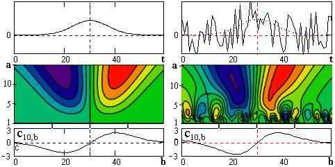 На рис. 2.1.4 приведен пример применения вейвлета для анализа двух однотипных сигналов, один из которых осложнен шумами с мощностью на уровне мощности самого сигнала. Как следует из рисунка, контурная масштабно-временная картина вейвлетных коэффициентов, а равно и ее сечения на больших значениях масштабных коэффициентов ‘а’ (малых доминирующих частотах вейвлетов) очень точно и уверенно фиксирует положение вершины информационного сигнала сменой знака коэффициентов С(a,b).