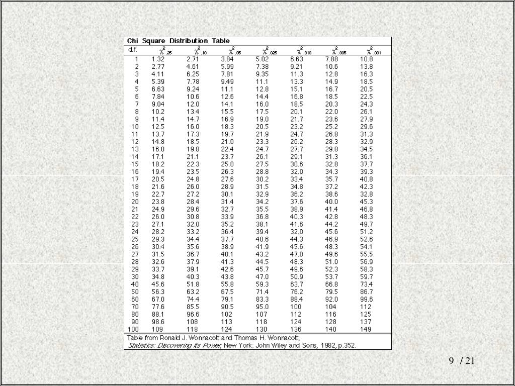Затем мы можем найти критическое значение для теста в таблице распределения хи-квадрат. Степени свободы равны (#rows-1) * (#columns-1) = (2-1) * (3-1) = 2, и проблема подсказала нам, что мы должны использовать альфа-уровень 0,05. Таким образом, по таблице распределения хи-квадрат критическое значение теста равно 5,991 .