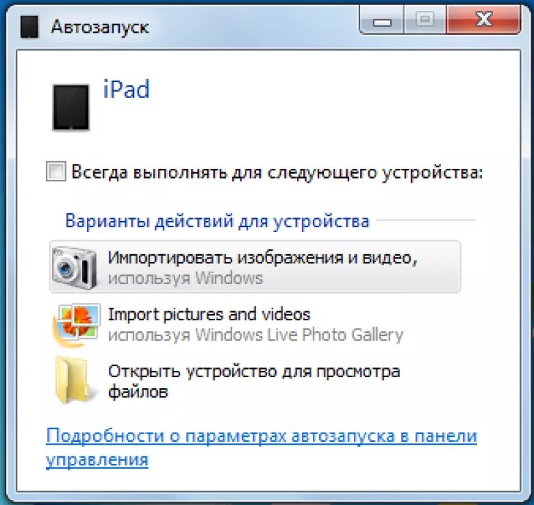 Совет. Если Вы хотите, чтобы при каждом подключении этого устройства открывалось приложение «Фото», установите флажок «Открыть Фото».