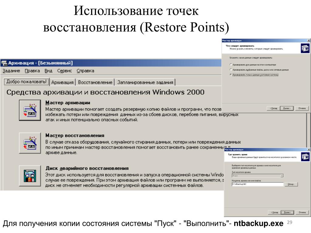 Не используйте средство архивирования в качестве средства резервного копирования или аварийного восстановления