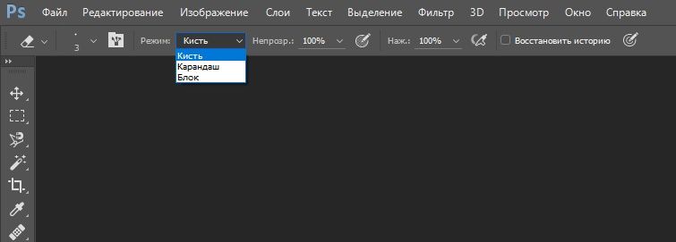 И выбрать режим: кисть, карандаш, блок. Для Кисти можно регулировать мягкость края. У Карандаша не будет мягких краев. Он работает более грубо. Квадратный ластик в фотошопе подключается как раз через режим Блок. Квадратным ластиком очень легко подчищать прямые углы на изображении.