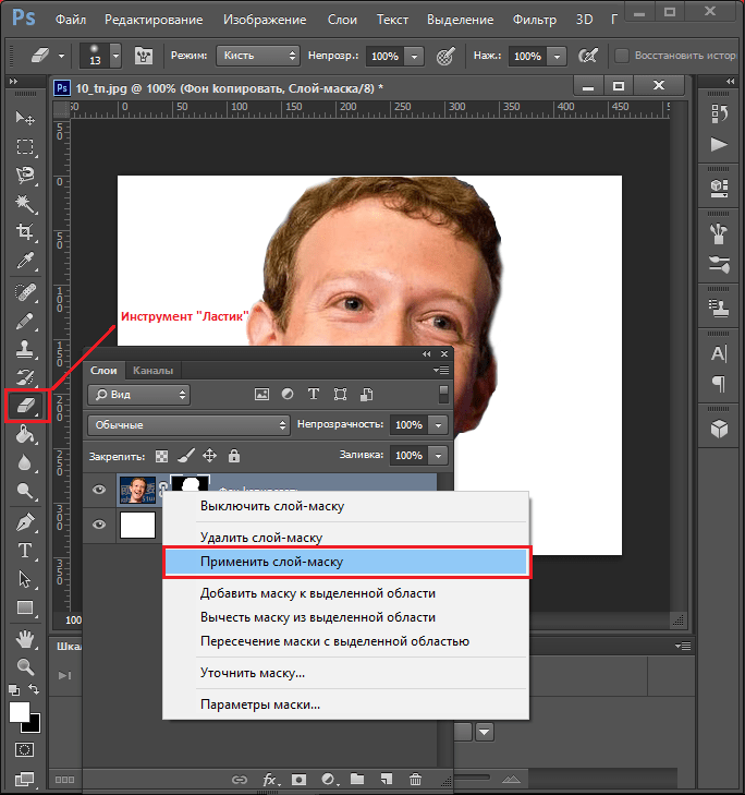 Обратите внимание, что вы можете столкнуться с проблемой, когда ластик в фотошопе не стирает, а рисует. Скорей всего вы пытаетесь работать ластиком на фоном слое (Фон). Чтобы его разблокировать, необходимо дважды по нему кликнуть. В результате у вас отобразится именно Слой.