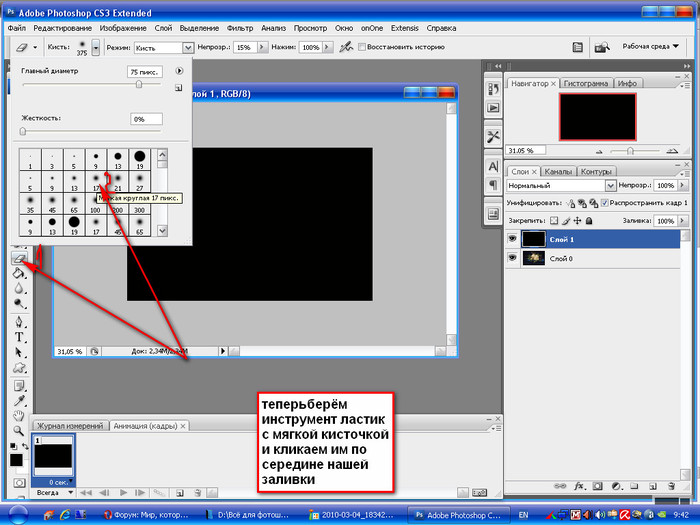 ERASER). - Теперь выберете нужный размер ластика. Это несложно. Помните как мы меняли размер кисти в одном из уроков? Также и здесь. В режиме ластика нажмите правую кнопку мыши на рабочем листе и выберете нужный размер, жесткость и даже вид. В общем то же самое! А теперь зажмите левую кнопку мыши и не отпуская ее начинайте стирать всё, что вам нужно, а точнее всё, что вам не нужно.