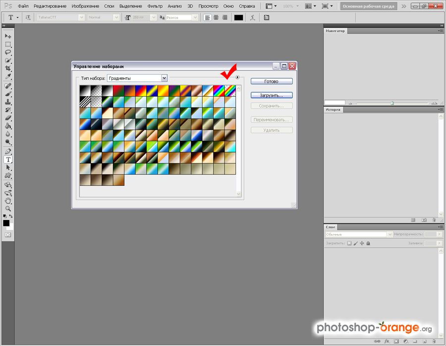 — если щелкнуть по стрелочке справа, то откроется палитра с вариантами градиента, при двойном щелчке перед стрелкой откроется окно редактирования градиента (здесь можно настроить свои варианты градиента).
