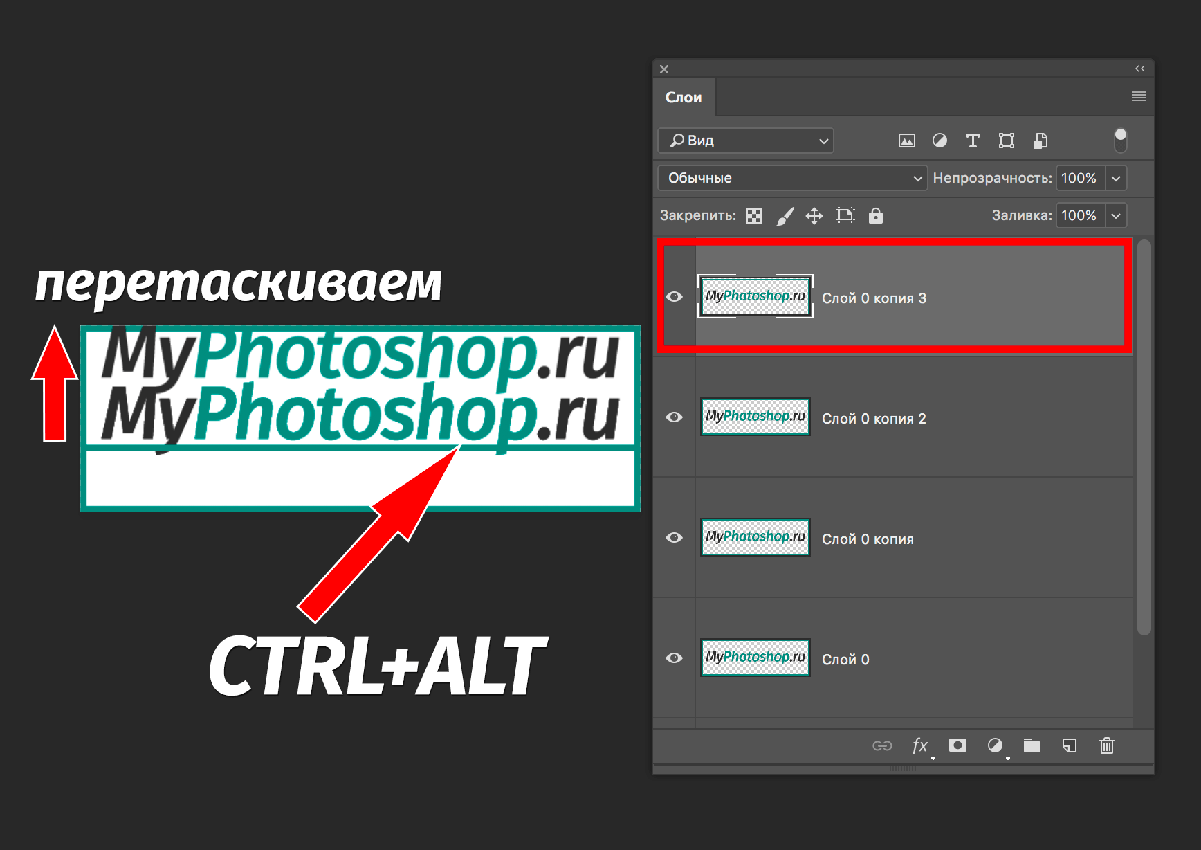Ну вот, не плохо! Давайте еще сделаем отражение текста . Нам нужно копировать слой с текстом. Для этого встаем на него, затем нажимаем клавишу Alt и удерживая ее кликаем по тексту, которые на картинке и перетаскиваем вниз, получается копия слоя. Она нам как раз и нужна, чтобы сделать отражение текста.