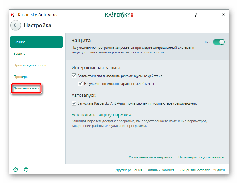 Дело в том, что некоторые модификации вирусов умеют самостоятельно отключать или вовсе удалять с компьютера антивирусную защиту и в некоторых случаях сразу этого можно не заметить, подвергая компьютер риску заражения. Чтобы такого не произошло, достаточно установить простенький пароль, который будет запрашиваться при заданных нами случаях: