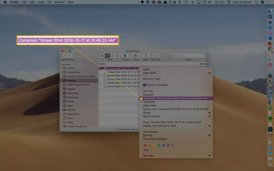 ) на файле или папке, которые вы хотите сжать. В качестве альтернативы перетащите рамку выбора на несколько файлов и/или папок с помощью курсора, удерживая левую кнопку мыши или нажимая на трекпад. - Выбрать Сжать [имя файла] или Сжать элементы X из контекстного выпадающего меню.