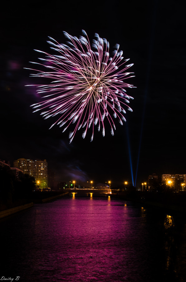 Красиво смотрится отражение вспышек света в воде. Для правильного ракурса можно найти возвышение, чтобы фейерверк получился почти на одном уровне с камерой.