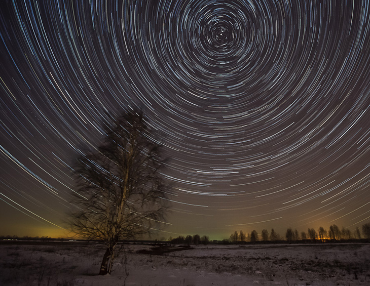 Фотосъёмка ночного звёздного неба на длительной выдержке позволяет получать снимки с красивыми светящимися дугами – траекториями движения звёзд. Особую выразительность кадру может придать наличие на переднем плане, например, старого сухого дерева или другого малоподвижного предмета.