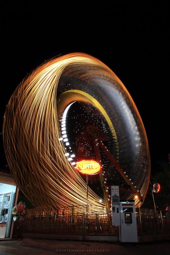 В настройках камеры выберите Ручной режим или Режим приоритета выдержки (TV) и установите длительность выдержки в зависимости от скорости вращения колеса обозрения (что-то между 1-30 сек). Съёмку лучше всего производить с помощью таймера автоспуска или используя спусковой тросик – это позволит избежать нежелательного сотрясения камеры при нажатии на кнопку спуска.