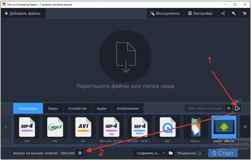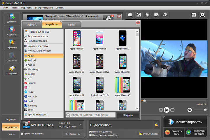 д., можно просто скачать Movavi Video Converter. В программе есть готовые профили для всевозможных мобильных устройств: Apple iPod, iPhone и iPad, Nokia, Samsung, Sony PSP, телефонов на Android и многих других. Вам нужно будет только выбрать свое устройство из списка, чтобы перевести видео в подходящий для него формат.