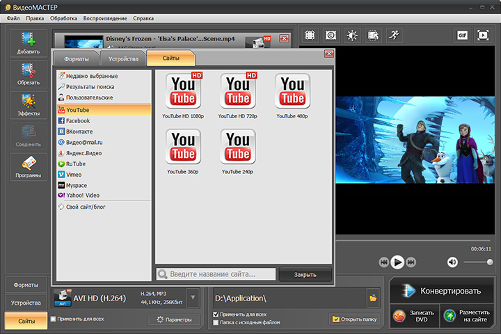 Также нередко пользователи задаются вопросом «А можно ли поменять формат для загрузки ролика в сеть?» Ответ — конечно же да! В ВидеоМАСТЕРЕ содержится целый раздел пресетов для сайтов. Там вы найдёте VK, YouTube, Vimeo, Facebook и многие другие. После изменения формата ваш ролик будет максимально оптимизирован под запросы конкретного видеохостинга.