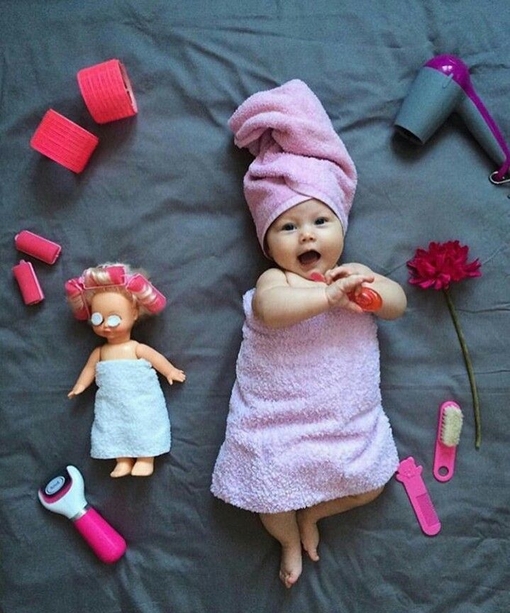 В этом возрасте сделать статичный снимок уже сложнее, так как ребенок ведет себя активно: постоянно играет с ручками и ножками и пытается держать голову. Поэтому фотографы советуют в таких случаях сделать акцент на движениях малыша, и дополнить его образ одеждой с яркими аксессуарами. Ребенка можно переодеть в рыбака, музыканта, принцессу, балерину, ангелочка — в любой костюм, который родителям удастся достать.