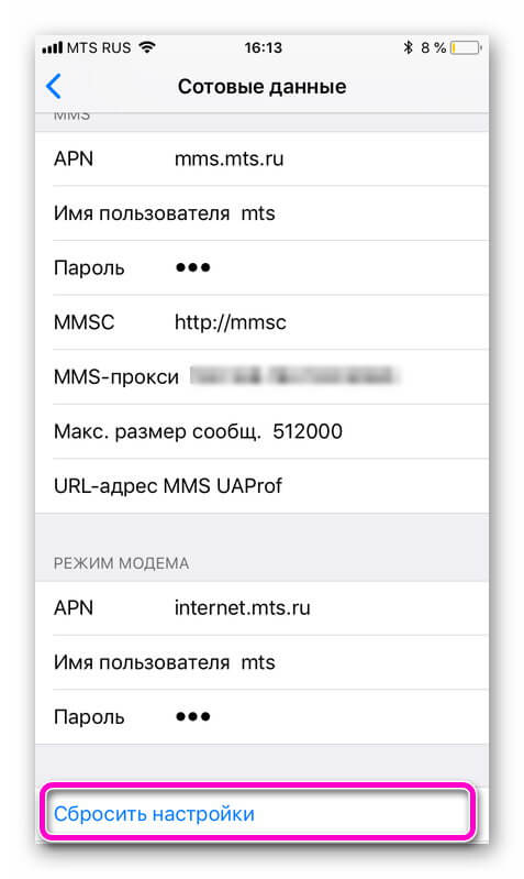 Данные APN, имя пользователя и пароль необходимо ввести по пути: Настройки → Сотовая связь → Параметры данных → Сотовая сеть передачи данных → раздел Сотовые данные. Например, для белорусского МТС, данные следующие: