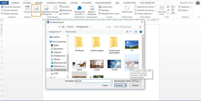 Выберите Вставка > Рисунки > Это устройство, чтобы добавить изображение на компьютер.