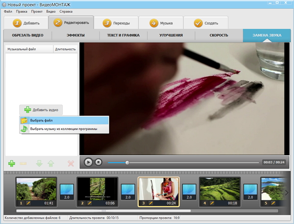 Аудио можно выбрать из бесплатного списка, выбрав «Коллекция музыки», или импортировать с памяти устройства нажав «Добавить музыку из файла». Можно загрузить больше одного трека, нажав на плюсик справа. Для настройки звукового ряда кликните на аудиодорожку правой кнопкой мыши и подберите нужный параметр.