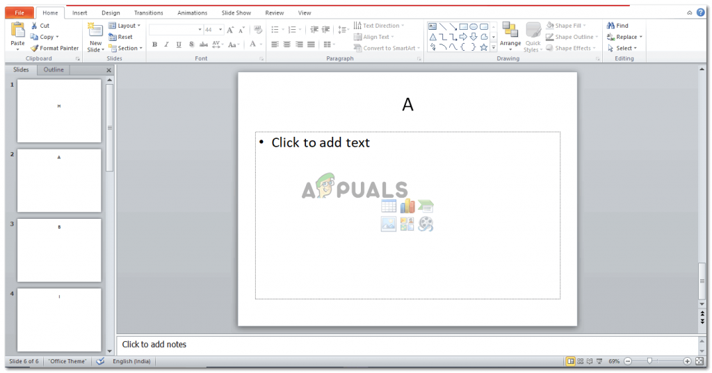 Удостоверьтесь, что у вас удалены любые текстовые окна по умолчанию или что-либо еще в новом слайде так, чтобы он был абсолютно чистым.