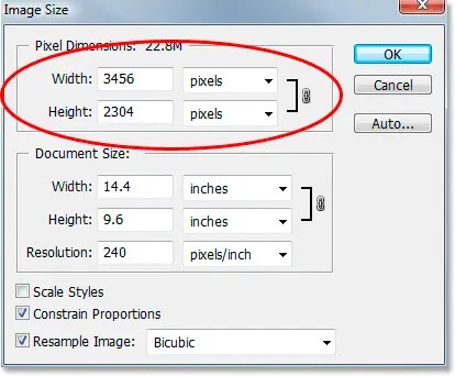 Я открываю в Photoshop диалоговое окно «Размер изображения», выбрав его из меню «Изображение». Если мы посмотрим в раздел «Размеры в пикселях» в верхней части окна, мы увидим, что моя фотография в том виде, в каком я перебросил ее с фотоаппарата, имеет ширину 3456 пикселей и высоту 2304 пикселей: