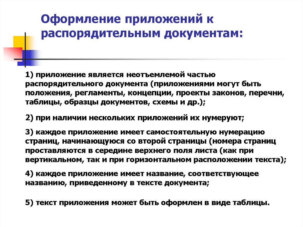 Возможные варианты неправильного оформления этим не ограничиваются. Однако правила оформления приложений к распорядительным документам регламентируются на примере указов и распоряжений Президента Российской Федерации в Типовой инструкции по делопроизводству в федеральных органах исполнительной власти.![]()