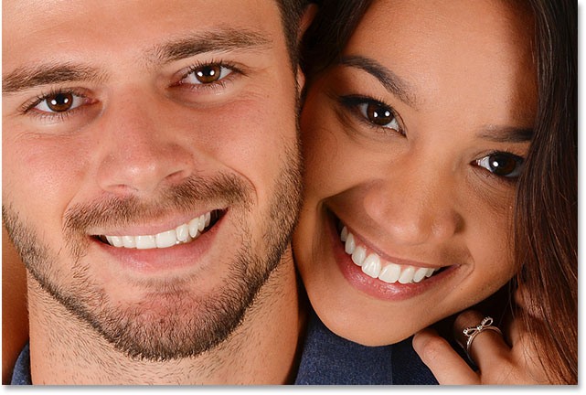 Вот изображение, которое я буду использовать в этом уроке. Зубы женщины уже выглядят красивыми и белыми, но зубы мужчины кажутся немного тусклыми и желтыми, и их можно немного отбелить: