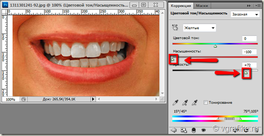 Теперь подвигаем ползунки тем самым сделаем наши зубы белыми.