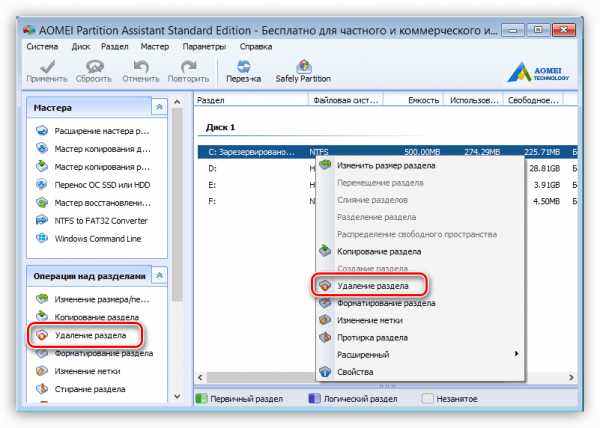 - Нажмите по разделу правой кнопкой мыши (ПКМ) и в контекстном меню выберите пункт «Удаление раздела», кстати, это же действие вы можете выполнить, нажав на одноименную кнопку на панели «Операции над разделами».
