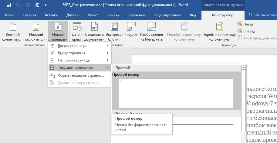 Применив этот способ, мы автоматически уберем нумерацию со всех страниц документа, кроме нумерации выполненной с помощью параметра «Текущее положение».