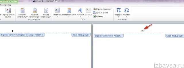 - Во вкладке «Конструктор», в области «Переходы» нажмите один раз левой кнопкой мыши по кнопке «Перейти к нижнему колонтитулу». После этого, кнопка «Как в предыдущем» будет отключена. Уберите галку с пункта «Особый колонтитул для первой страницы», если она включена в настройках программы.
