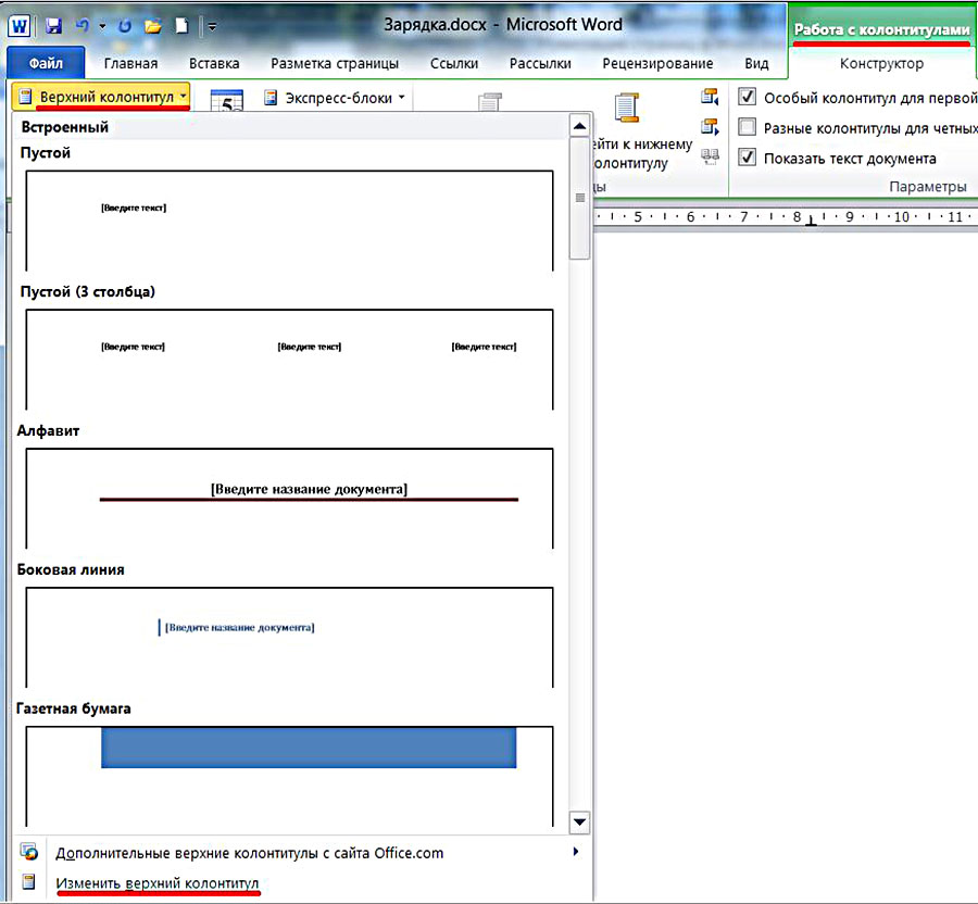- В контекстном меню нажмите на кнопку «Изменить верхний колонтитул» или «Изменить нижний колонтитул».