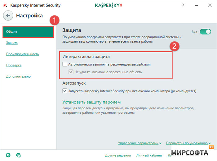 Если вам требуется временно ограничить работу программы — просто отключаем функционирование, не обязательно копаться в настройках. Это делается пунктом ниже — “Приостановить работу файлового антивируса”, где можно настроить нужный промежуток времени для отключения защиты.