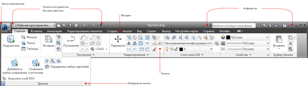 Команды, необходимые для построения чертежа и его редактирования, расположены на панелях инструментов («Рисование», «Редактирование», «Слои» и др.). Эти команды помогут вам начать изучении программы AutoCAD, а наши статьи из раздела самоучителя «Автокад для начинающих» дадут полное представление о них. Команды структурированы и находятся на ленте-меню. Тематические вкладки, такие как «Вставка», «Аннотации» и др. содержат наборы панелей инструментов. Это позволяет быстро находить необходимую команду.