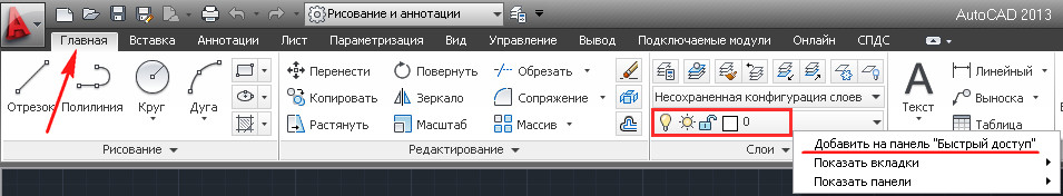Поскольку панель «Слои» на ленте по умолчанию находится на вкладке «Главная», вам придется переключаться между вкладками ленты, если вы работаете с аннотациями или вставкой и другими инструментами, не основанными на вкладке «Главная». Возможность быстро установить текущий слой или настроить состояния слоев, не переключаясь между вкладками ленты, сэкономила мне время и сделала черчение намного более эффективным.
