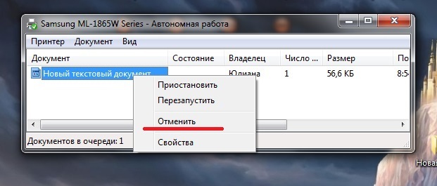 - Теперь вам необходимо выбрать задание на печать из очереди, которое необходимо отменить.