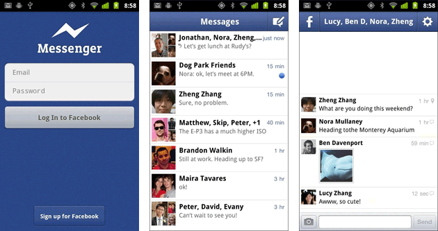 Используя такое приложение можно вести диалоги, не заходя на сайт. Это очень удобно когда находишься вдали от дома. К таким утилитам относятся: Facebook Messenger, Facebook Poker и Facebook jabber.