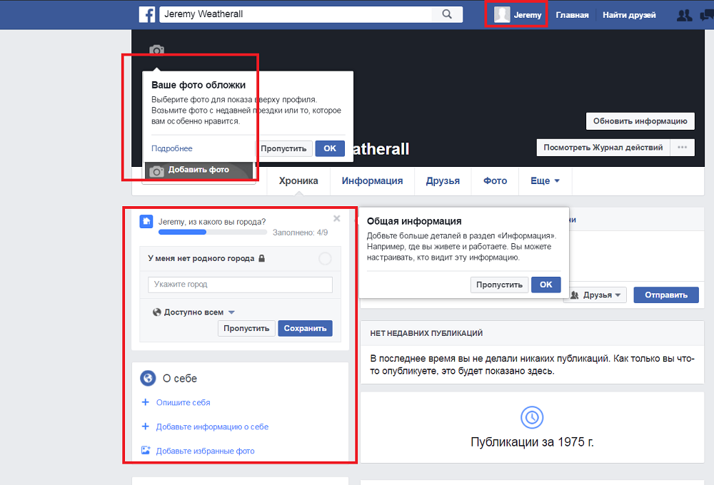 2. Если вы находитесь на странице своего Профиля (то есть щелкнули по своему имени слева от надписи Главная справа вверху экрана), то как раз здесь-то и возможны всякие неожиданности!
