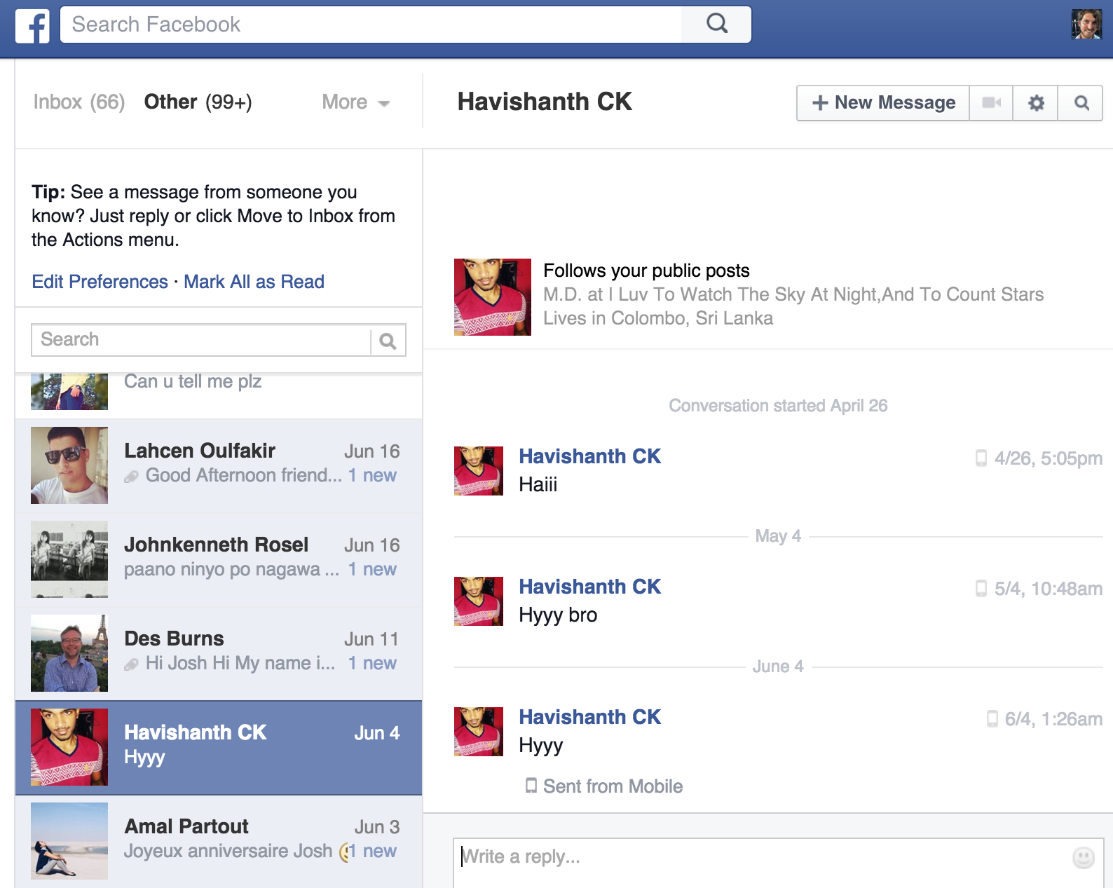 На странице Входящие вы можете прочесть всю свою личную переписку в Facebook, включая историю диалогов в чате. Когда вы получаете сообщение в чате, оно появится на этой странице. Отсюда удобно управлять вашими чатами и сообщениями, читать и удалять их.