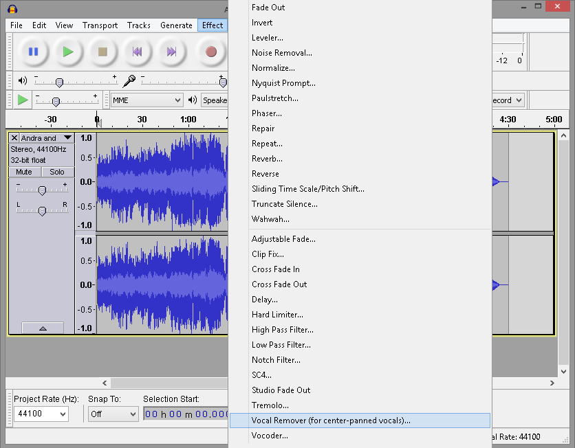- Шаг 1. Сначала выделим весь трек. Это можно сделать двойным кликом левой кнопкой мышки по аудиодорожке, через меню Вставить – Все или с помощью CTRL+A.
