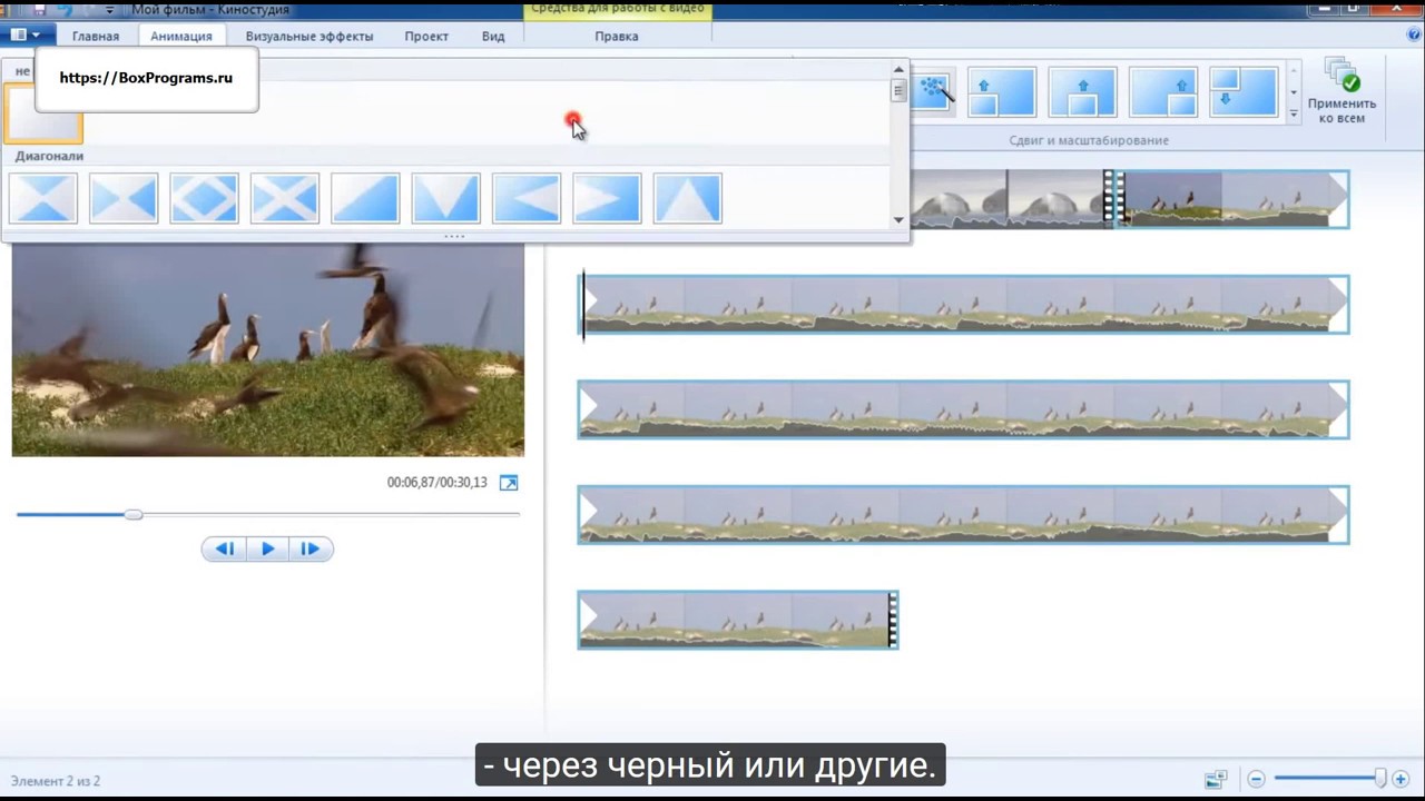 Анимации позволяют переходы между клипами. Появление и исчезновение видео или аудио и т. д.
