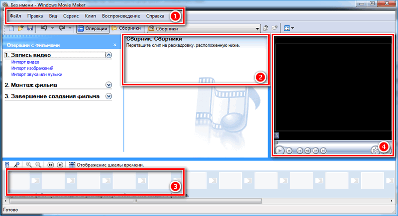Программа Windows Movie Maker состоит из трех основных частей: области основных компонентов интерфейса, раскадровка или шкала времени и монитор предварительного смотра На панели «Задачи» перечислены типичные задачи, которые бывает необходимо выполнить при создании фильма, в том числе импорт файлов, редактирование фильма и его публикация.
