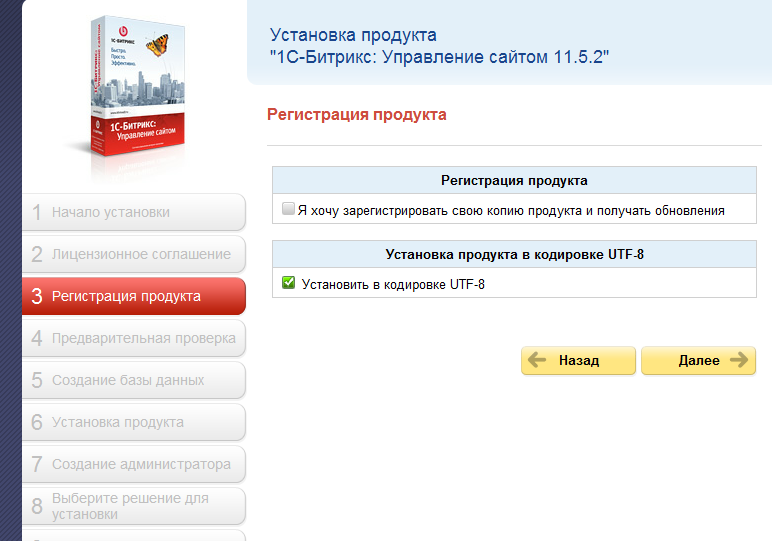 - В пункте «Регистрация продукта» нужно заполнить поля: «Ваше имя», «Ваша фамилия», «Email» и поставить галочку на строке «Установить в кодировке UTF-8», после чего нажать «Далее».